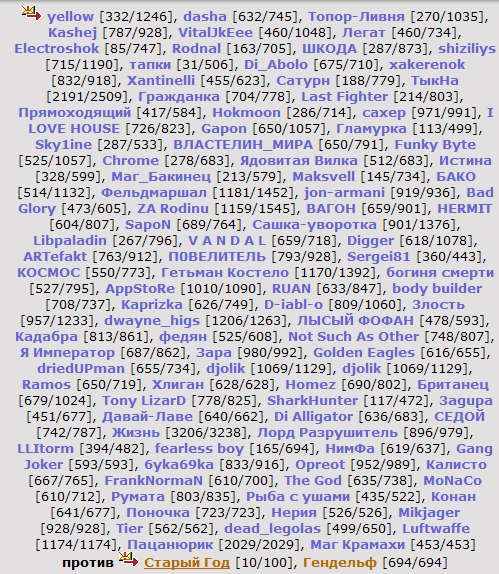 00:11 Бой закончен, победа за yellow, dasha, gremlin, Топор-Ливня, Злодеяния, LRMkin, Kashej, Кукурузка, VitalJkEee, Легат, Electroshok, Qrinqo, Rodnal, Prince exa, ШКОДА, shiziliys, тапки, Di_Abolo, xakerenok, Xantinelli, Сатурн, ТыкНа, ракета для бригадира (зверь ТыкНа), Гражданка, Last Fighter, Прямоходящий, Hokmoon, caxep, I LOVE HOUSE, Gapon, Kennedy, Гламурка, Sky1ine, ВЛАСТЕЛИН_МИРА, Funky Byte, башкатык (зверь Funky Byte), Chrome, last of samuray, Ядовитая Вилка, Истина, Маг_Бакинец, Maksvell, lezginec, Маг Звука, БАКО, Пацанюра, Фельдмаршал, Subara Impreza, jon-armani, Bad Glory, ZA Rodinu, ВАГОН, HERMIT, Dark Rail, SapoN, Сашка-уворотка, Libpaladin, V A N D A L, Digger, ARTefakt, П0ВЕЛИТЕЛЬ, Sergei81, Клювъ (зверь Sergei81), KOCMOC, Гетьман Костело, ГетькА (зверь Гетьман Костело), богиня смерти, AppStoRe, RUAN, body builder, Kaprizka, D-iabl-o, 3лость, dwayne_higs, ЛЫСЫЙ ФОФАН, Кадабра, федян, Not Such As Other, Я Император, Зара, Golden Eagles, driedUPman, djolik, djolik, Ramos, Хлиган, Homez, Британец, Хатабыч (зверь Британец), Tony LizarD, SharkHunter, 3agupa, Давай-Лаве, Di Alligator, СЕДОЙ, Жизнь, Лорд Разрушитель, LLItorm, fearless boy, НимФа, Gang Joker, 6yka69ka, Opreot, Калисто, FrankNormaN, The God, MoNaCo, Румата, Рыба с ушами, Конан, Поночка, Нерия, Mikjager, Tier, dead_legolas, Luftwaffe, Пацанюрик, Маг Крамахи, Braet, Дарк, Конан Варвар, 4EveR_Baku, MELBER, Избранный, Лысый Моньяк, ослиг, Тамплиер, Имхатэб, фефа
